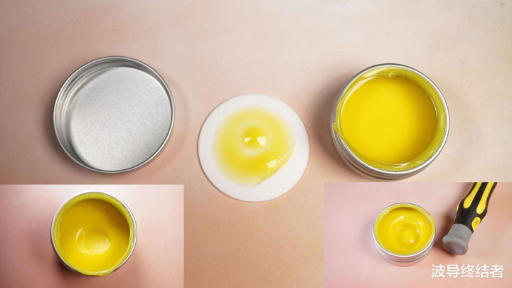 包装内给了一罐P4U样品,挺好玩的。平时处于半软状态,轻轻用手指按压就能弄出一个凹坑,如左下。而遇到强冲击力时,如图右下,我用螺丝刀柄头朝原来这个坑里用力击打10来下,材料迅速变硬扛住了冲击。