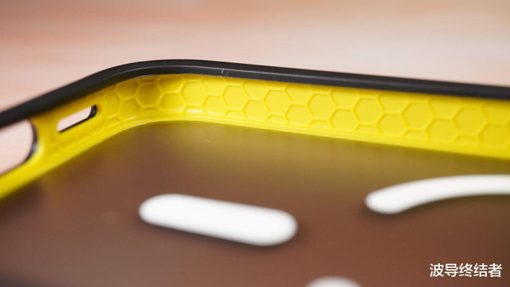 从里面来看手机壳边框,可以看到黄色的P4U非牛顿流体材料,还做了六边形蜂窝网格化结构,有效吸收冲击的同时,最大限度减轻手机壳的重量。奥海这款手机壳通过了SGS 5米6面的防摔认证,相较于其它传统的防摔手机壳,上手的感觉明显就要轻盈很多。