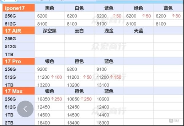 作者从一名华强北商家拿到的报价表显示,iPhone17标准版的溢价在100-200元,Pro溢价在200元,但蓝色版本溢价要低100元。溢价最高的还是ProMax,在500-1000元左右,其中256GB版本溢价最高,蓝色版本的则要低个100-300元。