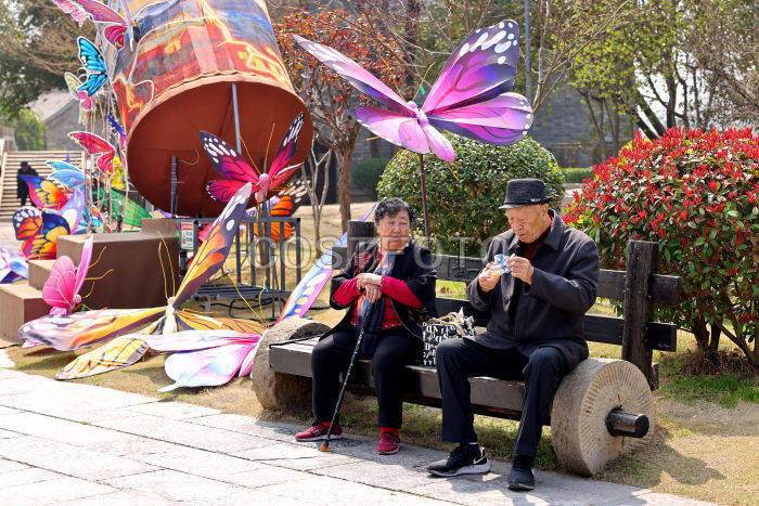 2026年3月25日,老年游客在山东省枣庄市台儿庄古城休息。