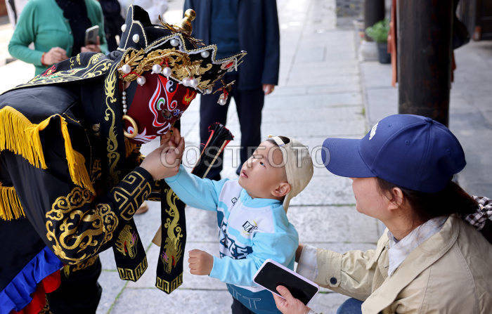 2026年3月25日,在山东省枣庄市台儿庄古城,表演“变脸”的艺人在与小朋友互动。(吉喆 孙淑婷/Costfoto,版权作品,严禁转载)