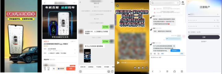商家展示并销售智能车钥匙,宣传可提供“手机远程控车”定制服务。用户下单后,商家客服暗示用户扫描二维码,跳转至第三方客服会话,并引导其下载第三方软件,随后以“升级需用原钥匙解码”为借口,索要用户地址,下单快递并通过上门取件的方式取走车钥匙。待商家收取用户钥匙后,未履行服务承诺,而是以“寄回车钥匙所需”为借口,要求用户垫资进行“刷单充值”,以此实施诈骗。
